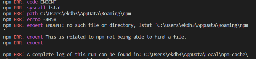 이 경로에 npm 폴더가 없었습니다. 역시 에러메세지에 답이 있었네요!