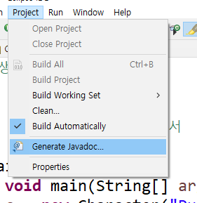 project도구의 Generate Javadoc을 누릅니다.