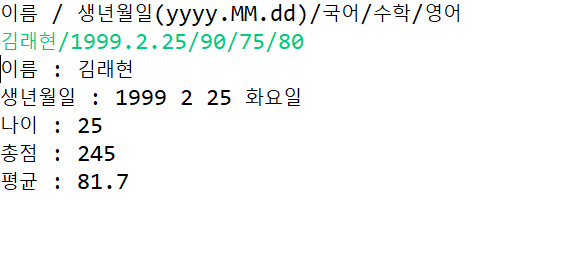 학생의 (이름 / 생년월일(yyyy.MM.dd) / 국어 / 수학 / 영어) 를 괄호안의 형식으로 입력받아서