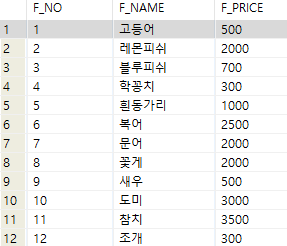 물고기 이름, 물고기 가격에 대한 데이터가 12개 들어있습니다.