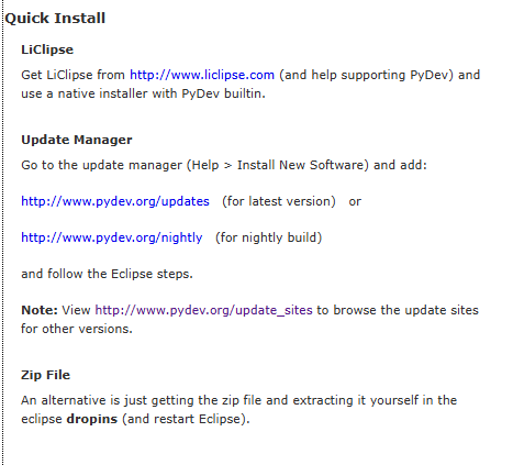 Important First time users are strongly advised to read the Getting started guide which explains how to properly configure PyDev. LiClipse The recommended way of using PyDev is bundled in LiClipse, which provides PyDev builtin as well as support for other