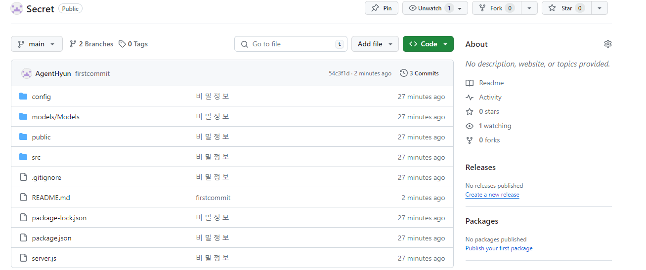 마지막으로 깃허브에 dev.js 파일을 제외하고 올려보겠습니다.