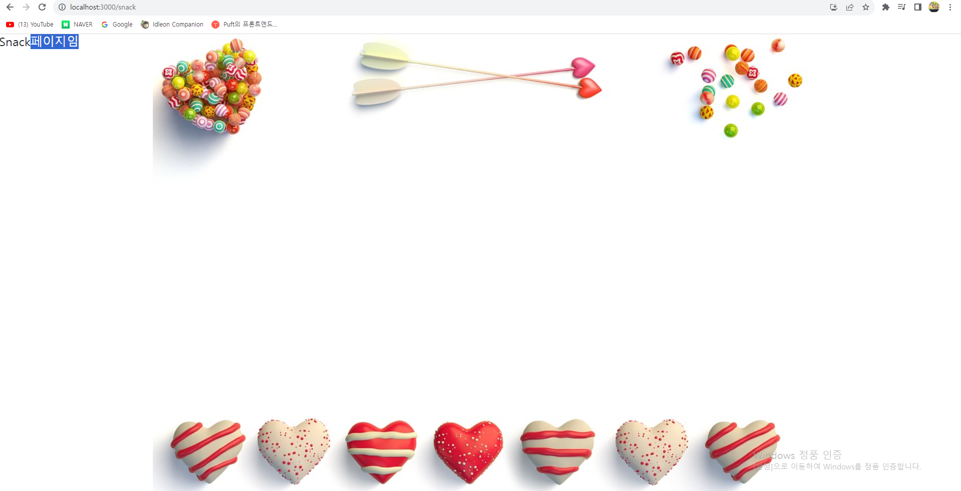 버튼을 누르면 이렇게 snack페이지로 이동합니다. 경로를 잘보시면 /snack이 추가되었습니다. snack페이지로 이동했단