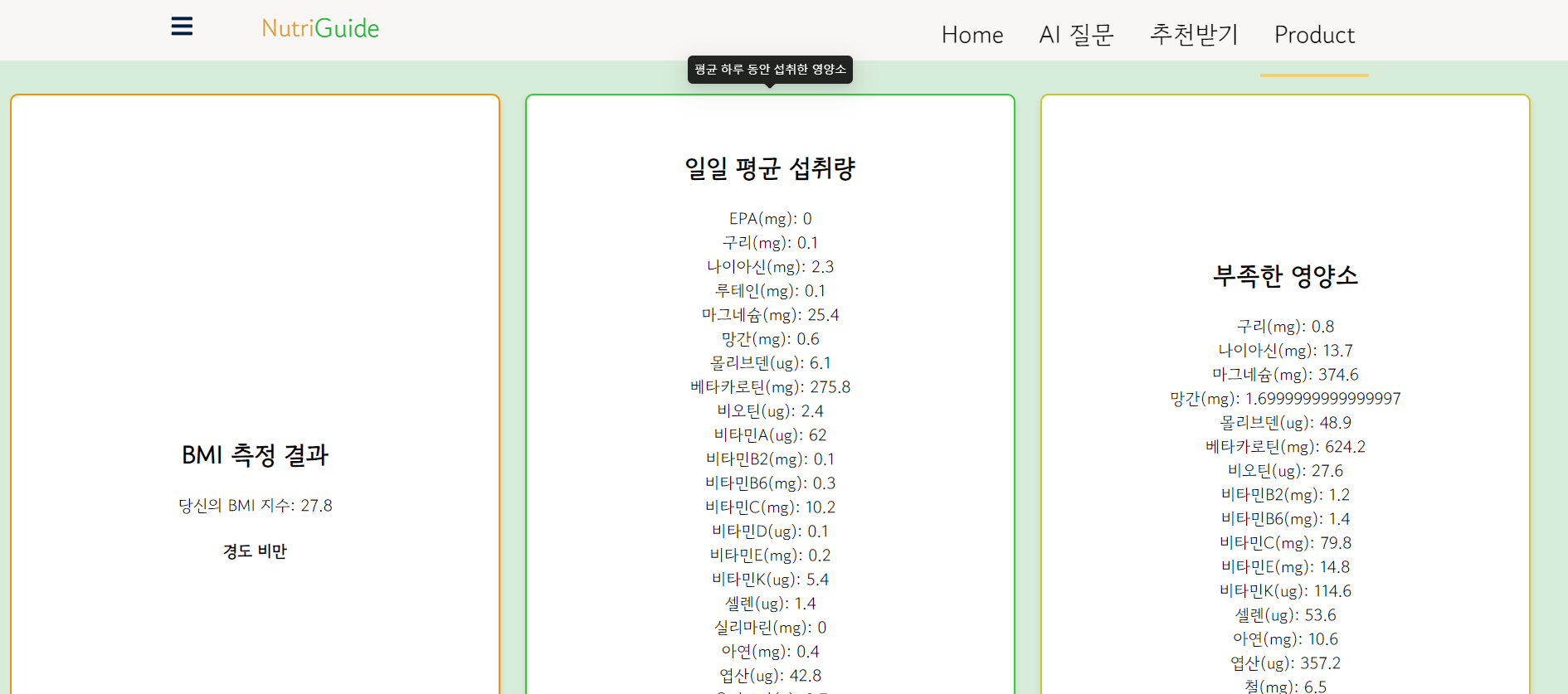 상단에는 BMI, 식단을 통계로 구한 일 평균 섭취량, 부족한 영양소 등을 보여줍니다.