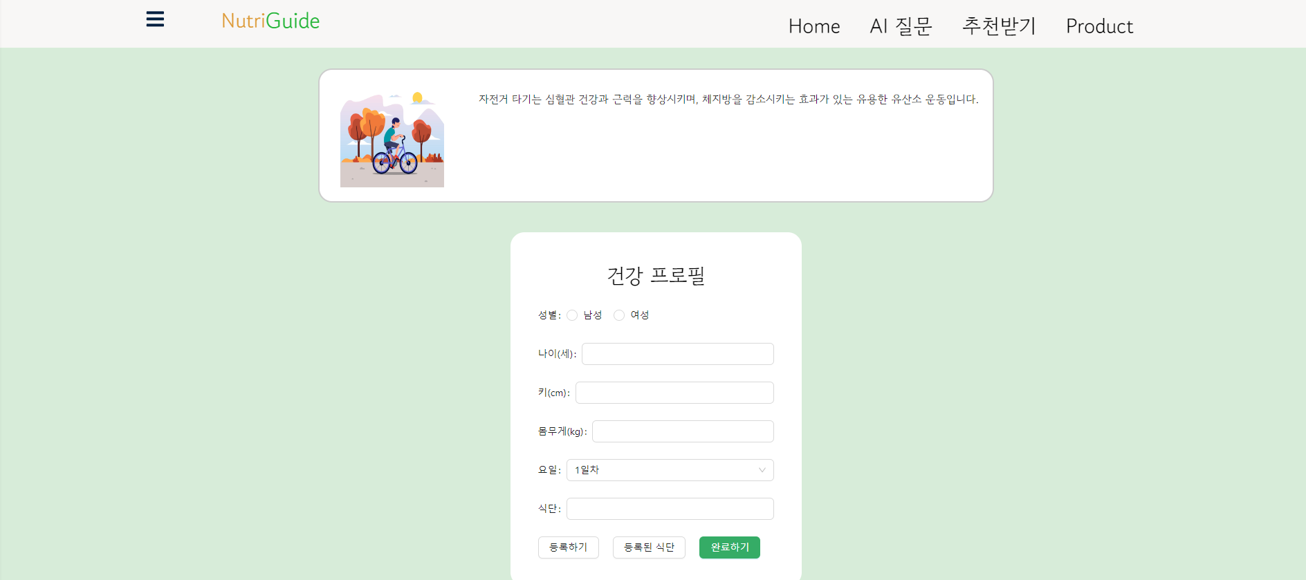 정보 입력페이지에서는 나이, 키, 몸무게, 식단을 입력합니다.