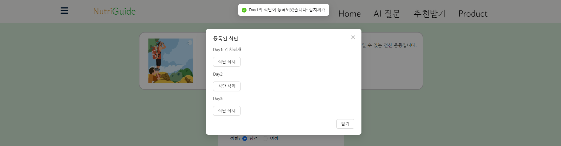 식단은 식단 등록창을 누르면 Modal창에서 확인할 수 있습니다.